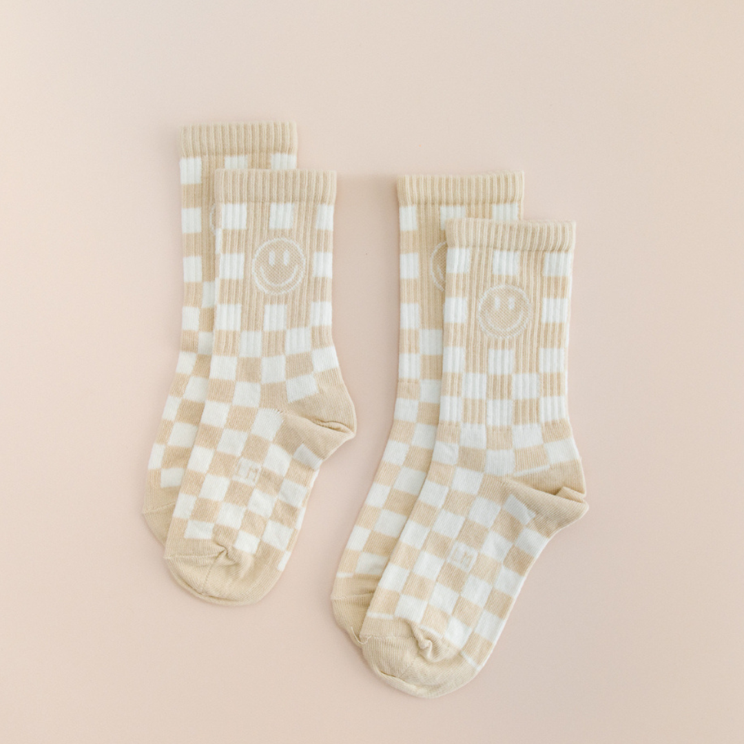 Hey Mom & Dad! Say hello to your new favorite matching moment! These playful checkered crew socks are designed for kids and their grown ups who love to move, explore, and look cool doing it. Featuring a soft, gender neutral palette and a hidden smiley face for a surprise dose of happy, they’re a subtle nod to the game of CHESS; classic, clever, and timeless.